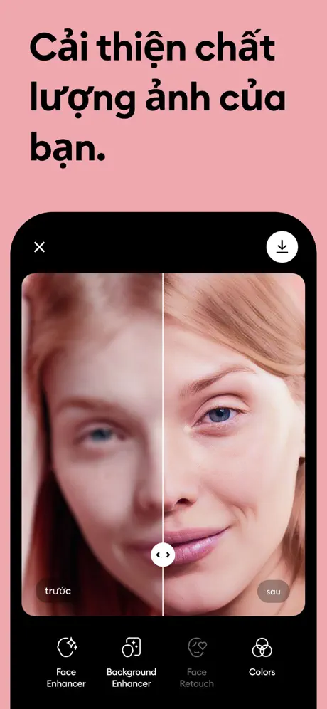 Chỉ với một thao tác, bạn có thể biến ảnh chất lượng thấp thành ảnh HD sắc nét. Đây là tính năng được sử dụng phổ biến nhất, đặc biệt với ảnh selfie hoặc ảnh chụp thiếu sáng.3. Nâng cấp ảnh chân dung